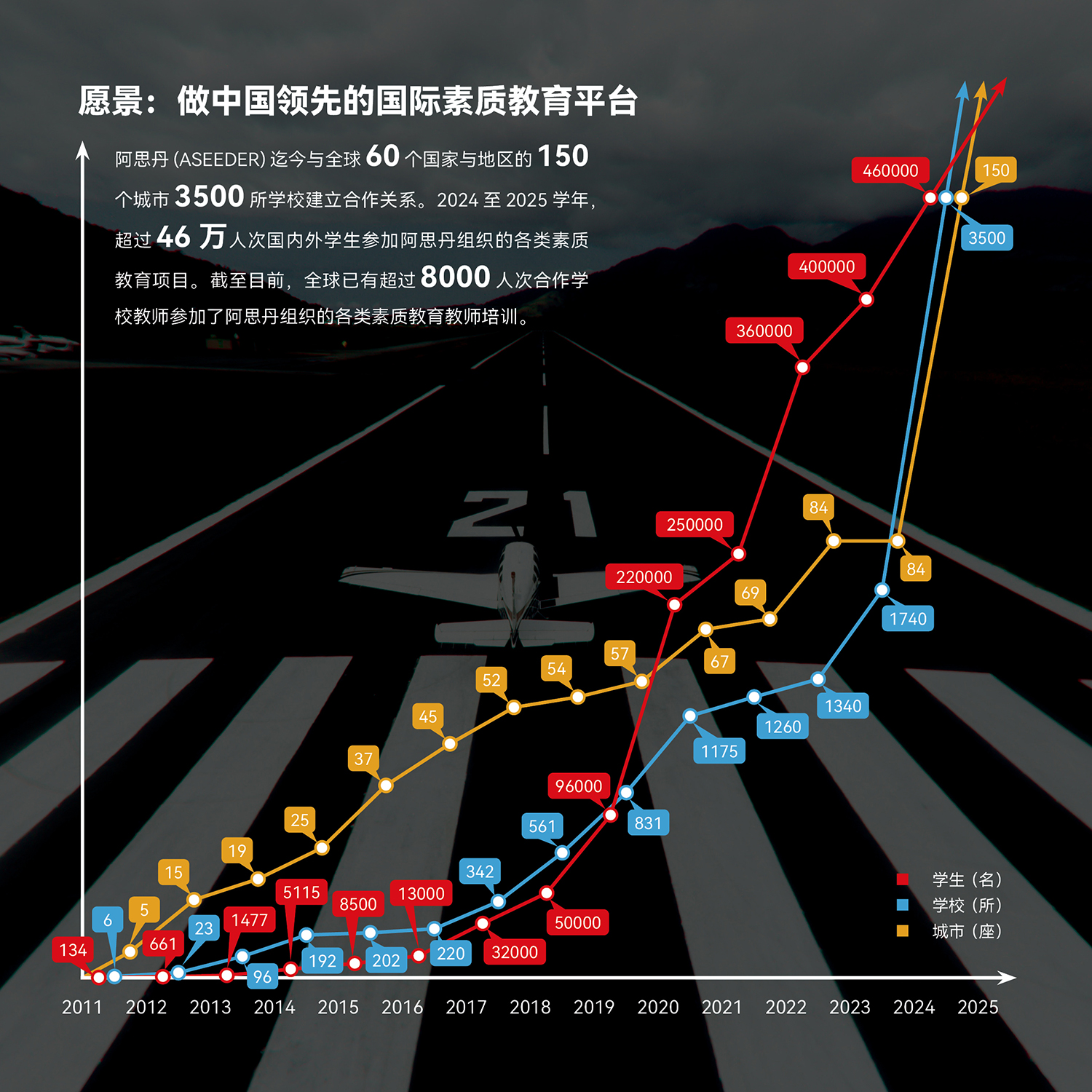 - 全年超过28万人次参加过阿思丹(ASEEDER)举办的各类国际素质教育项目。